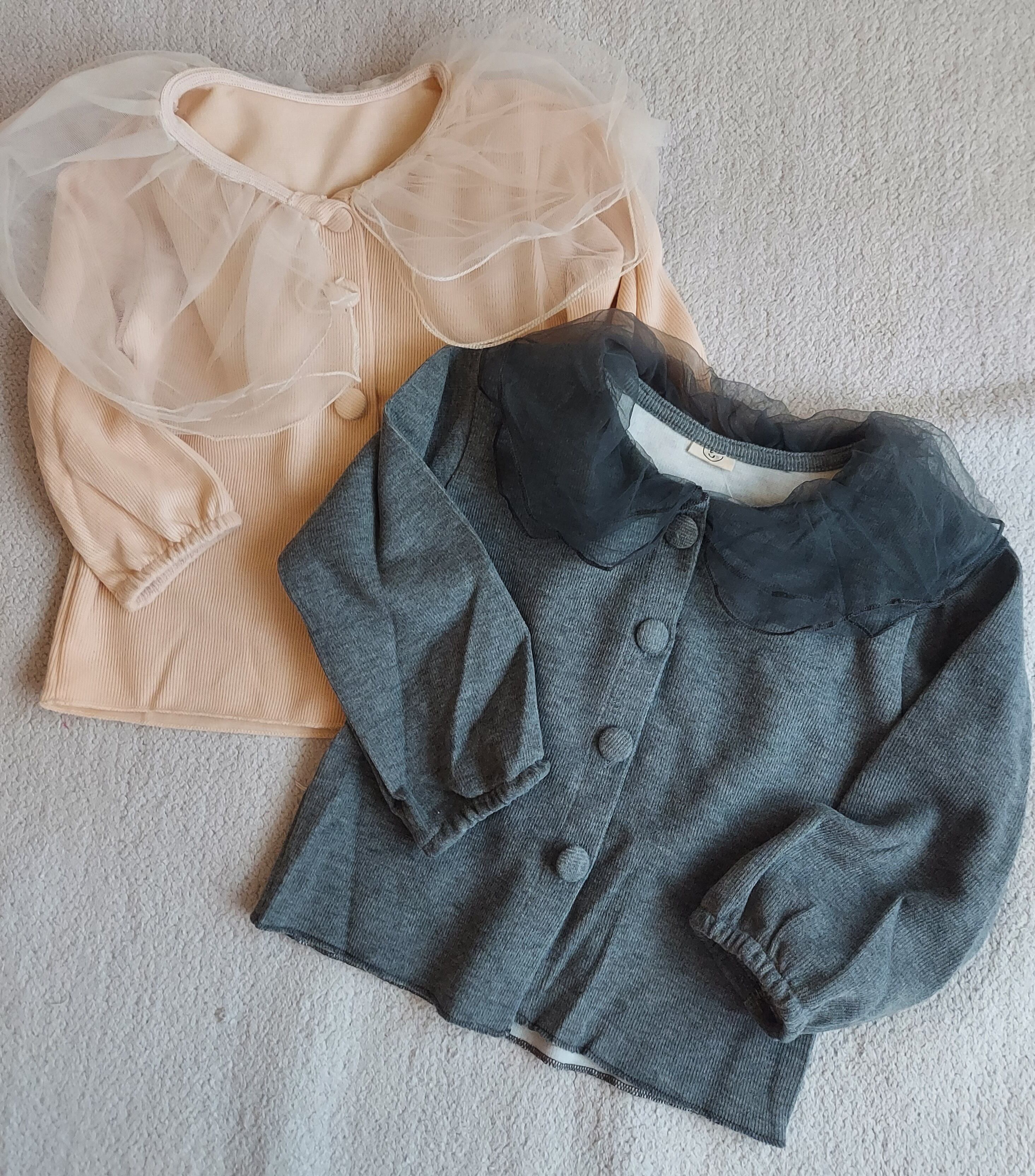 ベージュは張りのあるオーガンジー生地のBIGカラー、グレーは柔らかいシフォン生地の控えめなふんわりカラー♪